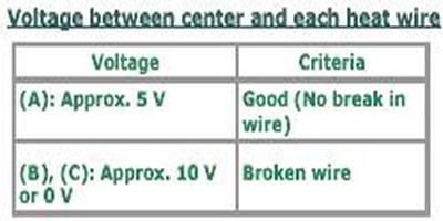 NOTE: If heat wire is free from damage, voltmeter should indicate 12 V at heat wire positive terminal end and its indication should decrease gradually toward zero at the other terminal (ground).