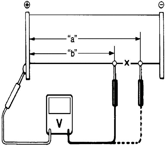c. The place where voltmeter fluctuates from zero "b" to several colts "a" is where there is damage.
