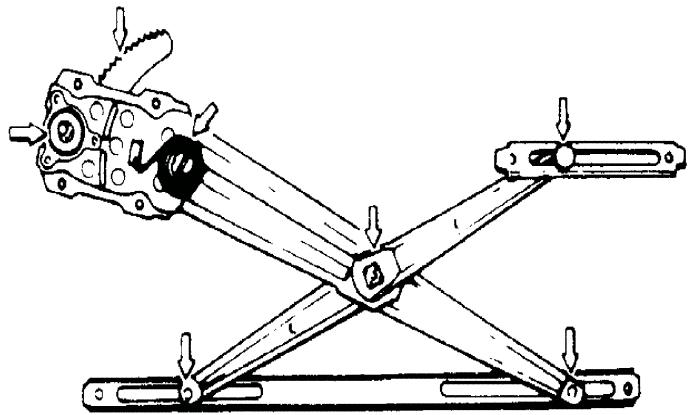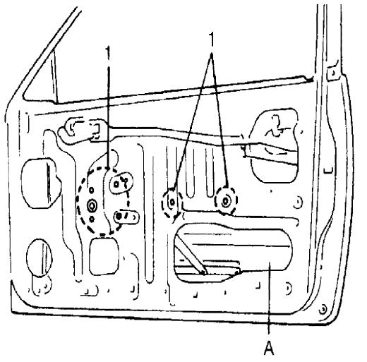 2. Remove window regulator attaching screws (1) (six pcs.).