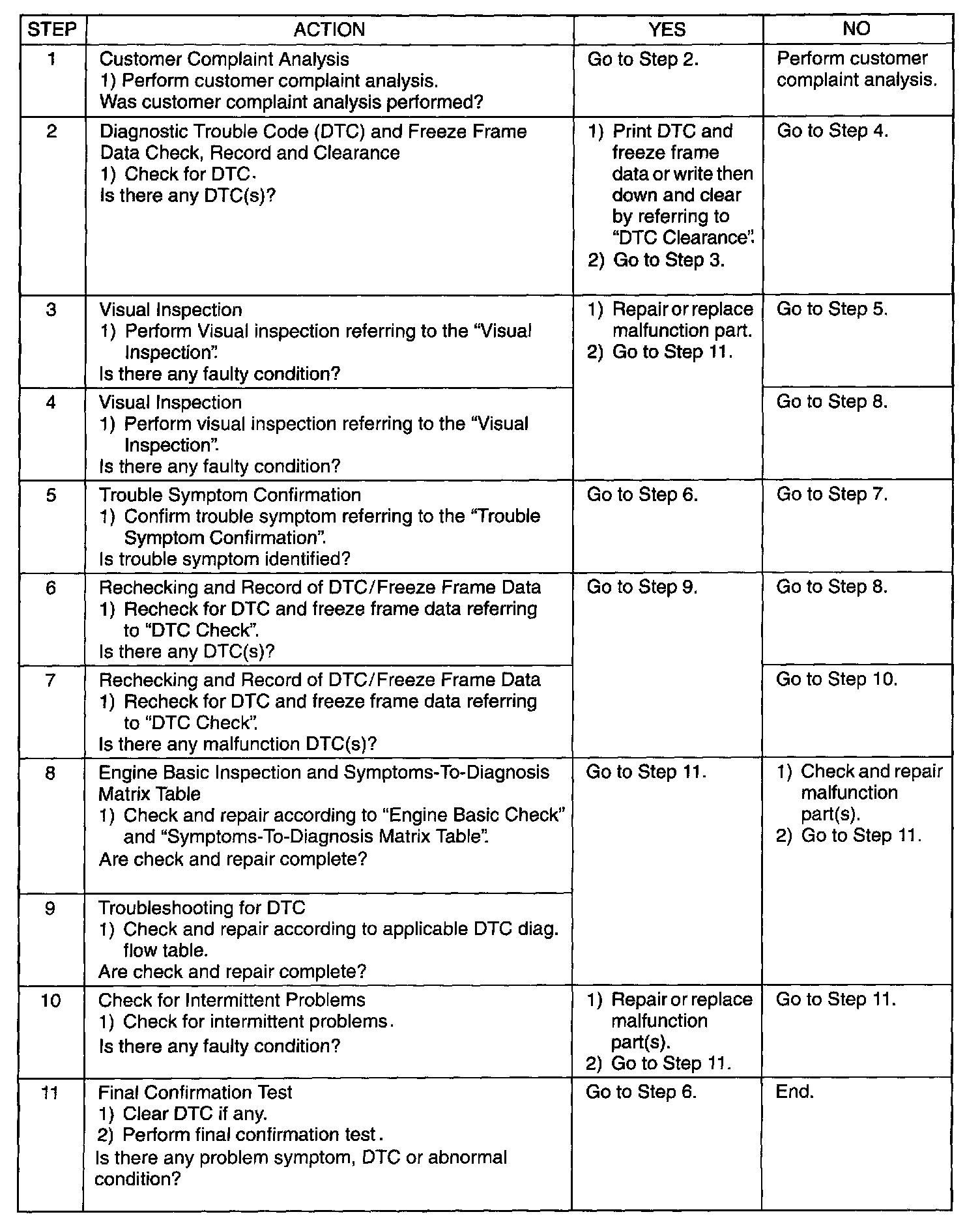 Perform basic engine check according to the "Engine Basic Check Flow Table" first. When the end of the flow table has been reached, check the parts of the system suspected as a possible cause referring to Diagnosis By Symptom; Symptoms- to-Diagnosis Matrix Table, and based on symptoms appearing on the vehicle (symptoms obtained through steps of customer complaint analysis, trouble symptom confirmation and/or basic engine check) and repair or replace faulty parts, if any.