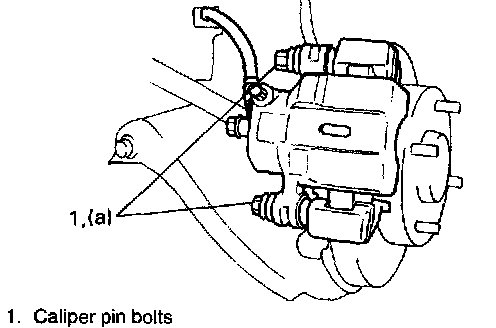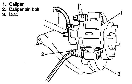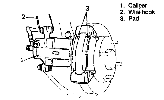 NOTE: Hang removed caliper with a wire hook or the like so as to prevent brake hose from bending and twisting excessively or being pulled. Don't operate brake pedal with pads removed.