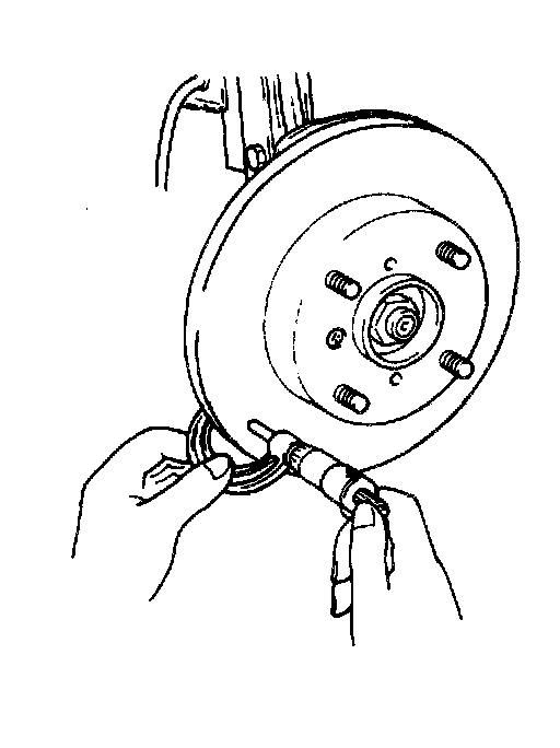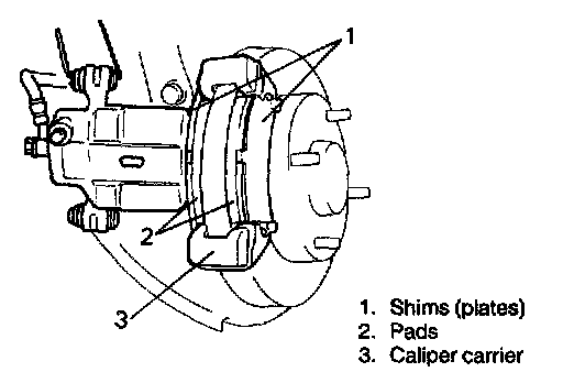 NOTE: When pads are removed, visually inspect caliper for brake fluid leak. Correct leaky point, if any.