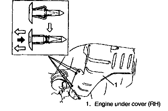 CAUTION: When raising engine, be careful not to raise it excessively and not to cause transmission to contact body, steering gear box, etc. Excessive raise may cause damage to engine, transmission, etc.