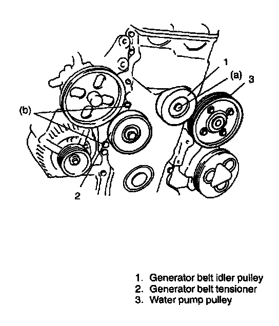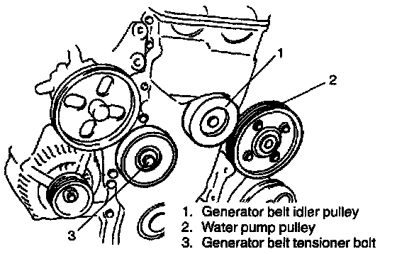17. Using lifting device, raise engine enough to allow removal of water pump pulley, generator belt idler pulley, generator belt tensioner and remove them.