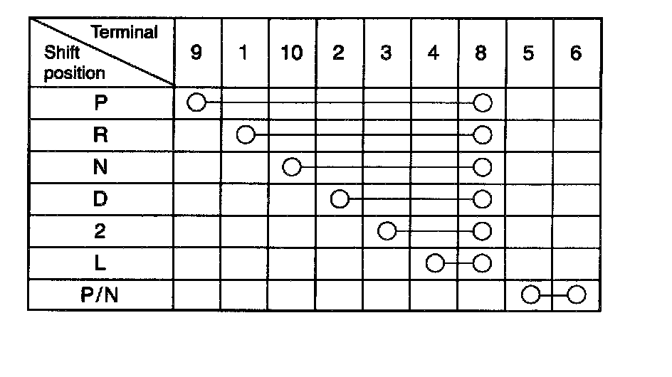 2. At each of P, R, N, D, 2 and L shift position, check continuity between terminals as well as each terminal and switch case. Continuity should be indicated only between those terminals as shown in table at each shift position. Continuity should not exist between any terminal and switch case. If malfunction is found, adjust or replace.