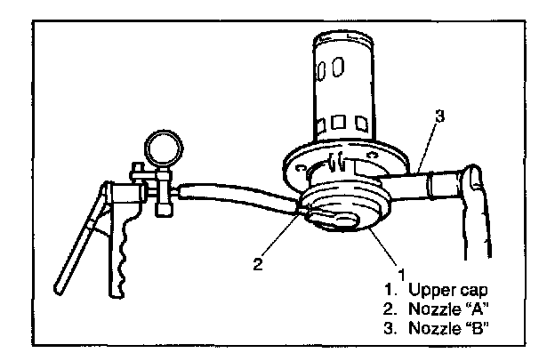 2. Apply 10 kPa (75 mmHg) vacuum to nozzle "A" while holding body with its upper cap facing downward and closing nozzle "B" with finger using vacuum pump gauge and check that vacuum is maintained at that level (there is no leakage).