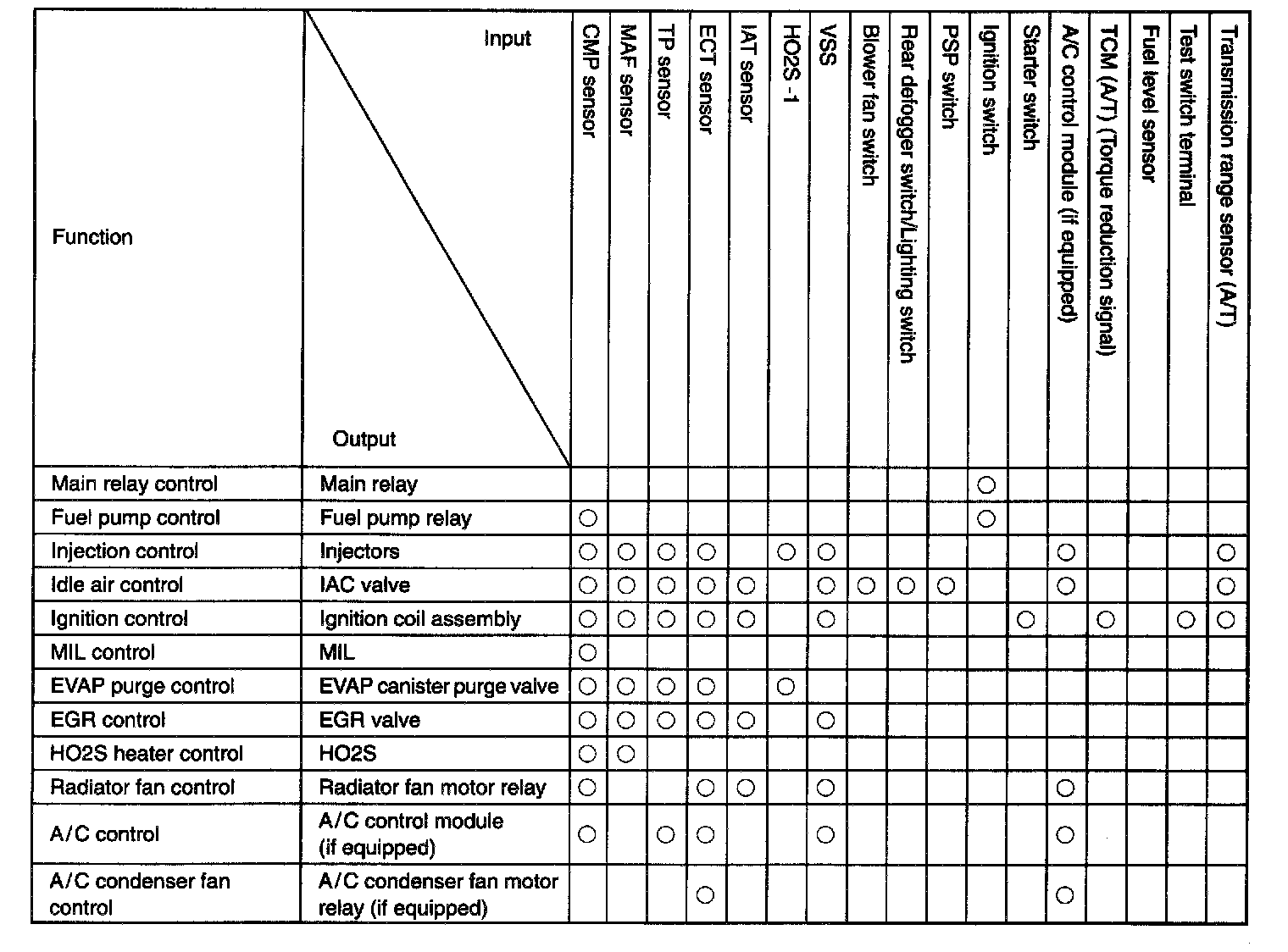 Engine & Emission Control Input / Output Table: