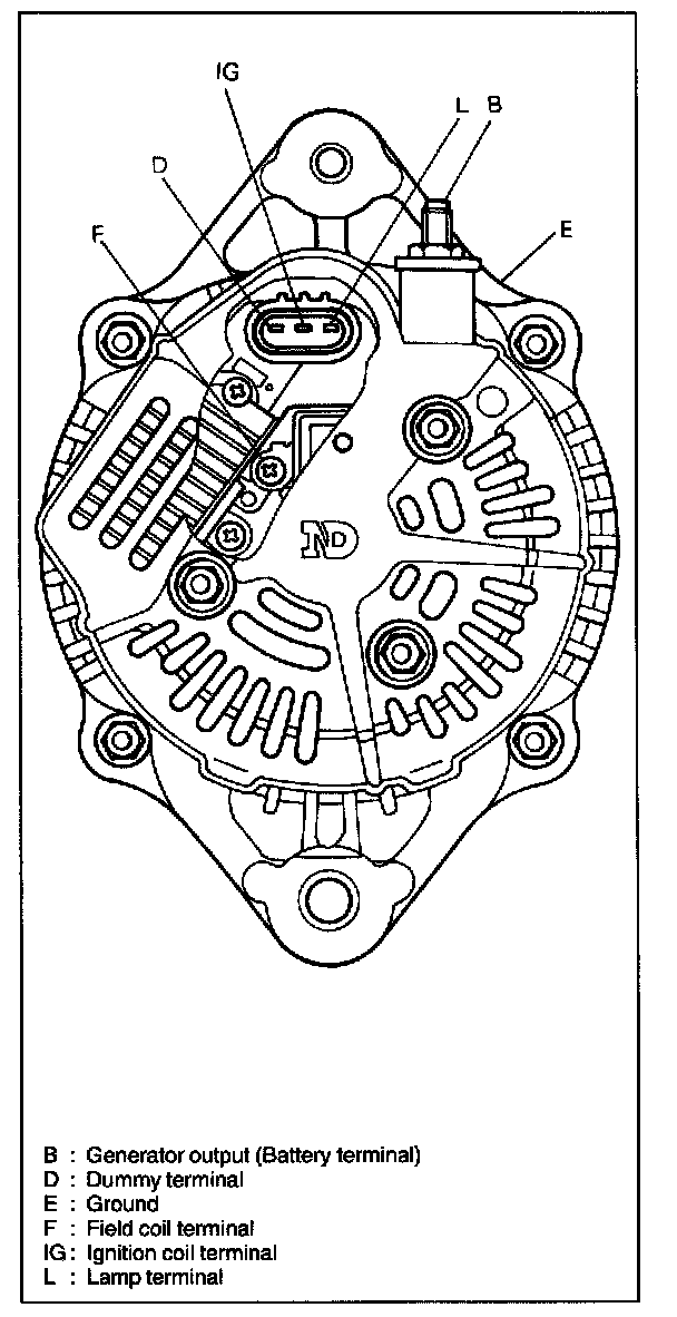 2. Ground F terminal and start engine, then measure voltage at B terminal as shown in the figure.