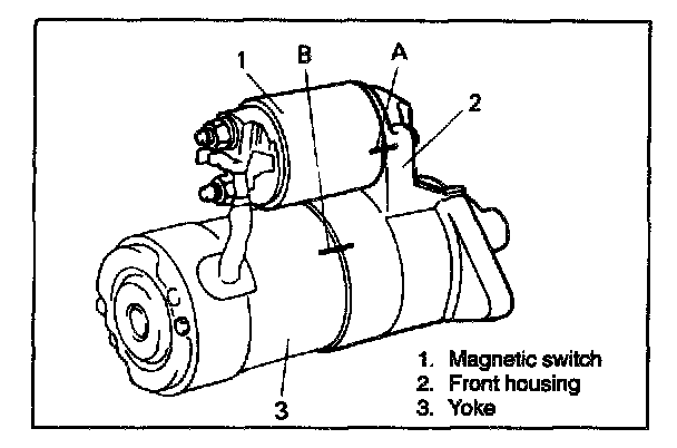 - Before disassembling starting motor, be sure to put match marks at two locations (A & B) as shown in figure so that any possible mistake can be avoided.