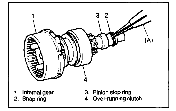 7. Remove snap ring, then pull out pinion stop ring and overrunning clutch and internal gear.
