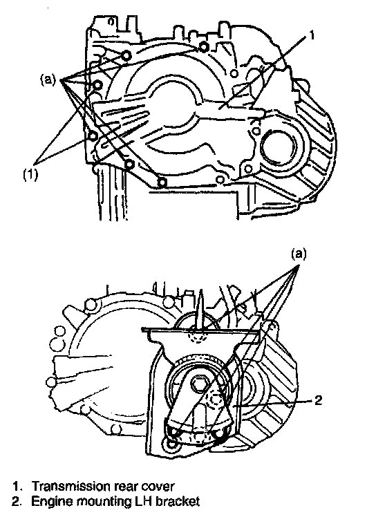 44. Tighten transmission rear cover and engine mounting LH bracket with ten (two new bolts (1)) bolts.