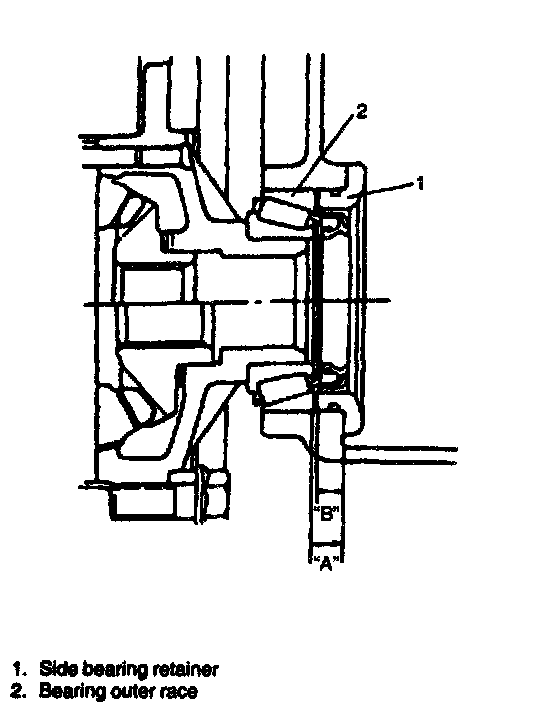 2. Measure clearance "A" (between differential side face and side bearing outer race) and "B" (bearing retainer).