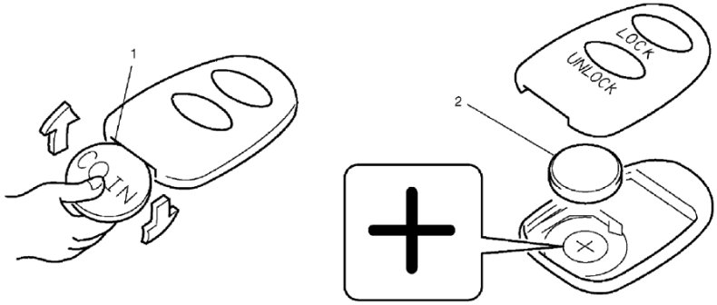 2. Replace the battery (lithium disc-type CR2032 or equivalent) (2) so its "+" terminal faces the "+" mark of the transmitter.