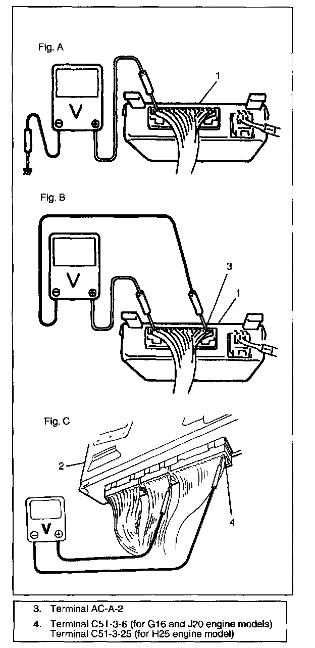 NOTE: For "Fig. A", "Fig. B", "Fig. C" in the figure, refer to "A/C CONTROLLER VOLTAGE VALUES TABLE".