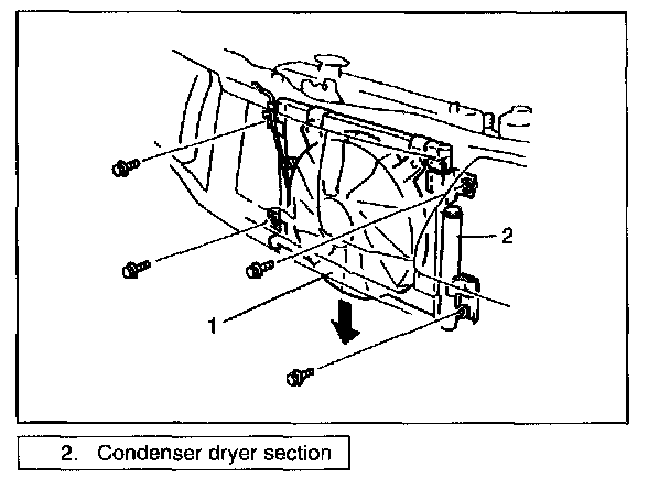 1. Remove A/C condenser assembly (1) from vehicle (Refer to "A/C CONDENSER ASSEMBLY").