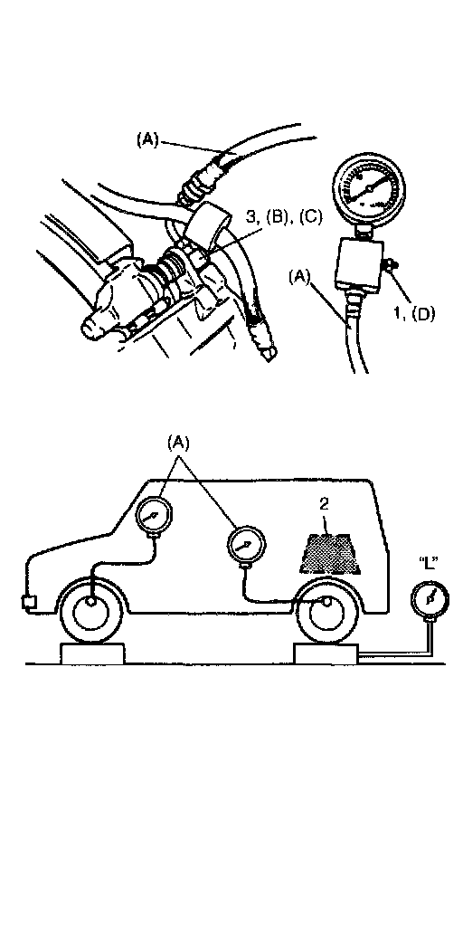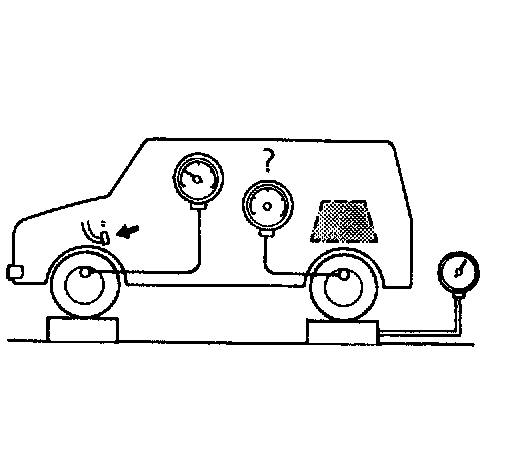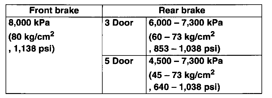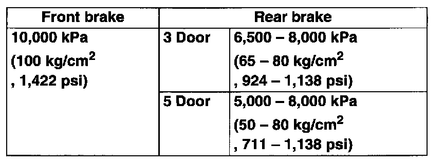 4. As done step 3), apply 100 kg/cm2 pressure to front brake and check that rear brake pressure then is within specification as given.