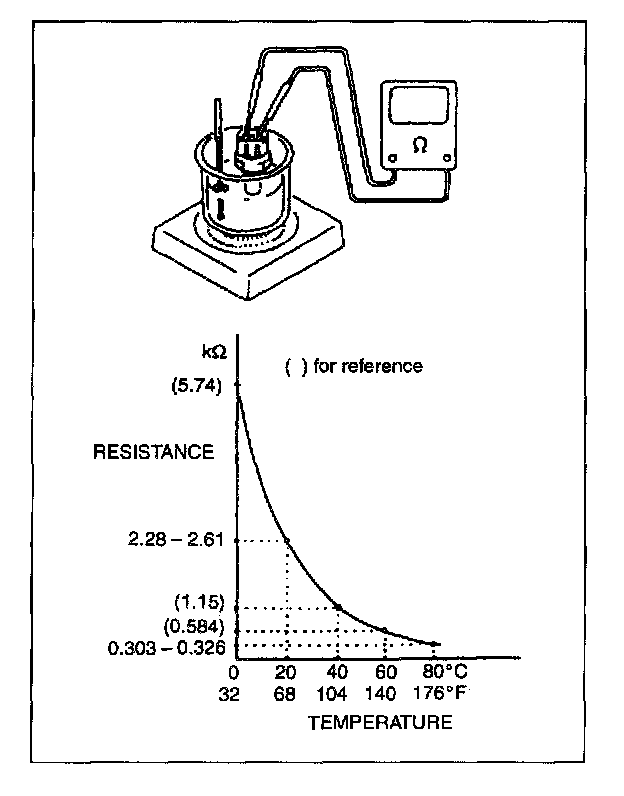 Immerse temperature sensing part of ECT sensor in water and measure resistance between sensor terminals while heating water gradually.