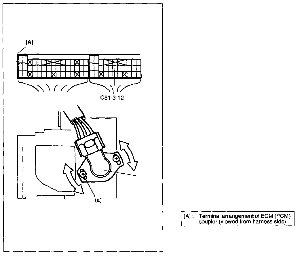 5. Turn TP sensor (1) clockwise or counterclockwise and tighten TP sensor screw at a position where voltage as specified below is obtained at coupler terminal C51-3-12.