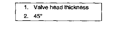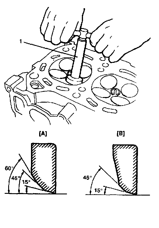 1. EXHAUST VALVE SEAT: Use valve seat cutters (1) to make 2 cuts as shown in the figure. 2 cutters must be used: the first for making 15° angle, and the second for making 45° angle. The second cut must be made to produce desired seat width.