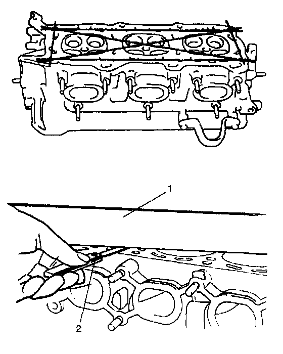 Check seating faces of cylinder head for manifolds, using a straightedge (1) and thickness gauge (2), in order to determine whether these faces should be corrected or cylinder head replaced.