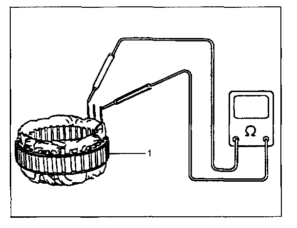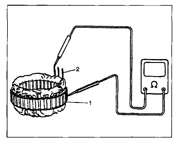 2. Using ohmmeter, check that there is no continuity between coil leads (2) and stator core (1). If there is continuity, replace stator (1).
