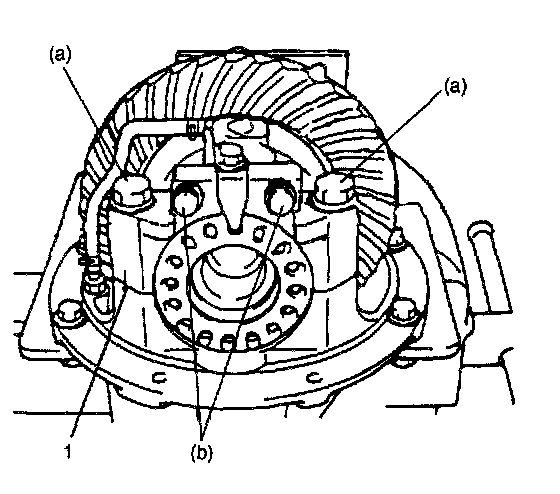 7. Tighten both bearing adjusters (1) so as to obtain specified gear backlash and at the same time, obtain preload of side bearing.