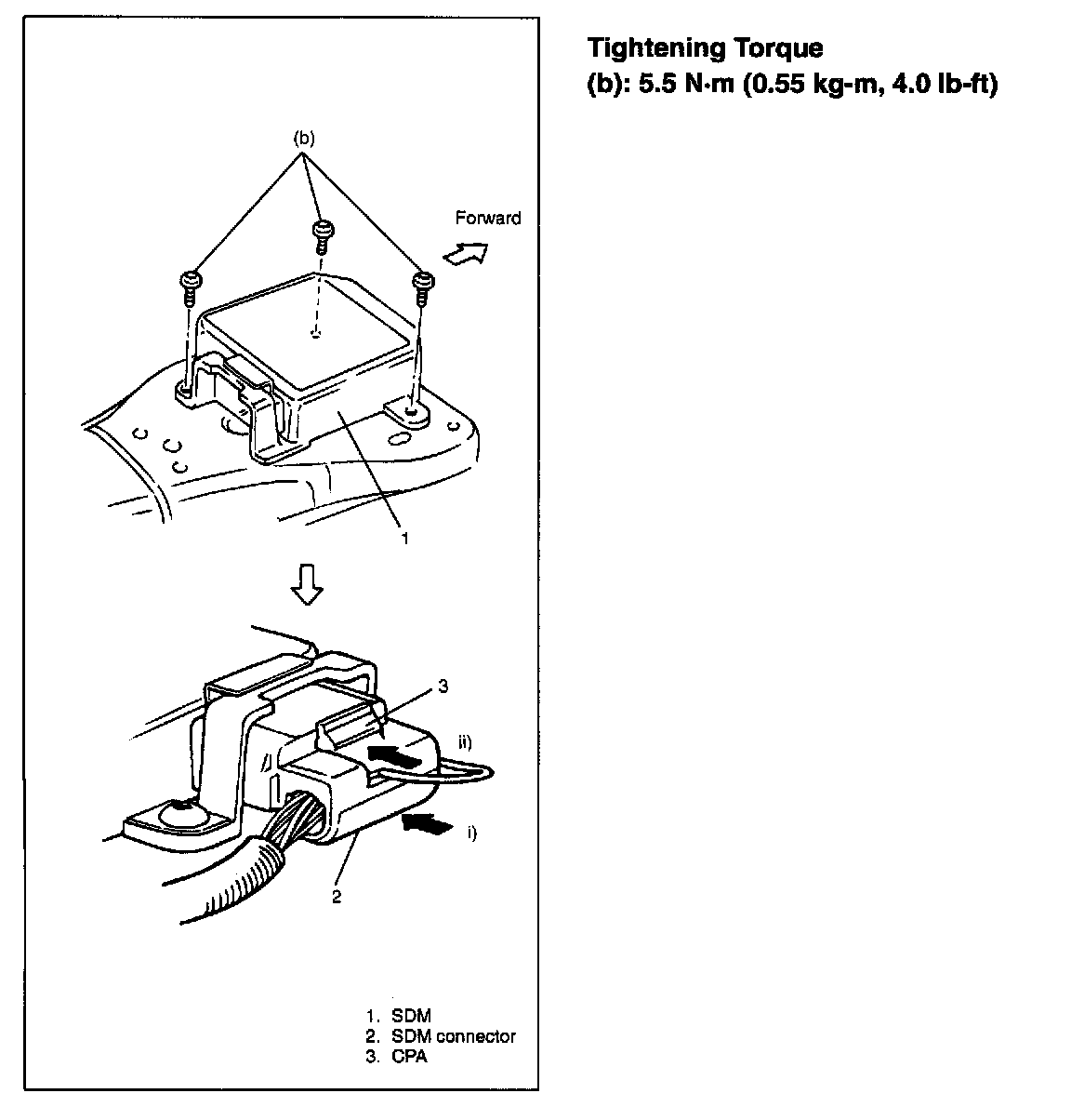 - Never power up the air bag system when the SDM is not rigidly attached to the vehicle. All SDM and mounting bracket fasteners must be carefully torqued to ensure proper operation of the air bag system. The SDM could be activated when powered while not rigidly attached to the vehicle which could cause deployment and result in personal injury.
