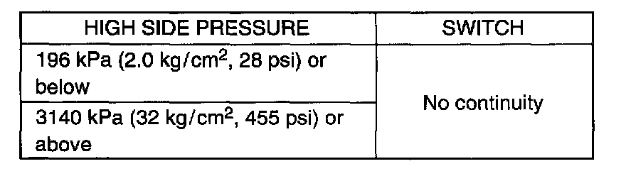 25 °C, 77 °F) when A/C system has a proper charge of refrigerant and when A/C system (compressor) is under operation. In each of these cases, switches should show proper continuity.
