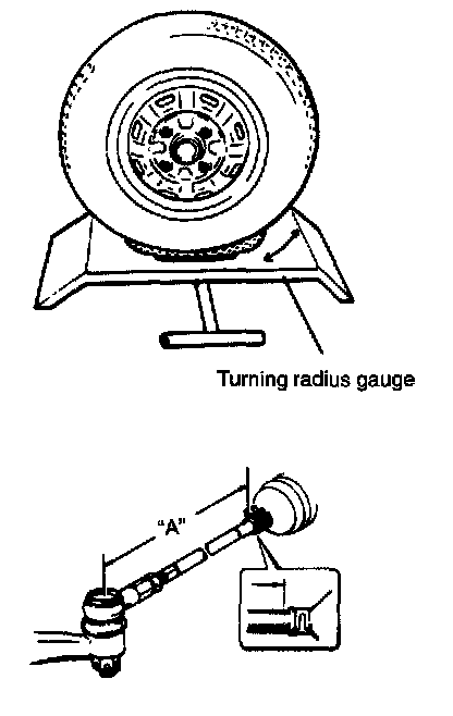When tie rod or tie rod end was replaced, check toe and then also steering angle with turning radius gauge. If steering angle is not correct, check if right and left tie rods are equal in length ("A").