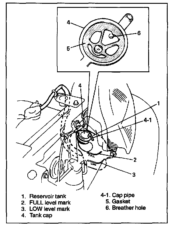 6. Add coolant to reservoir tank so that its level aligns with Full mark. Then, be sure to check cap gasket is located as shown figure and breather hole is not plugged, and then reinstall cap directing cap pipe forward.
