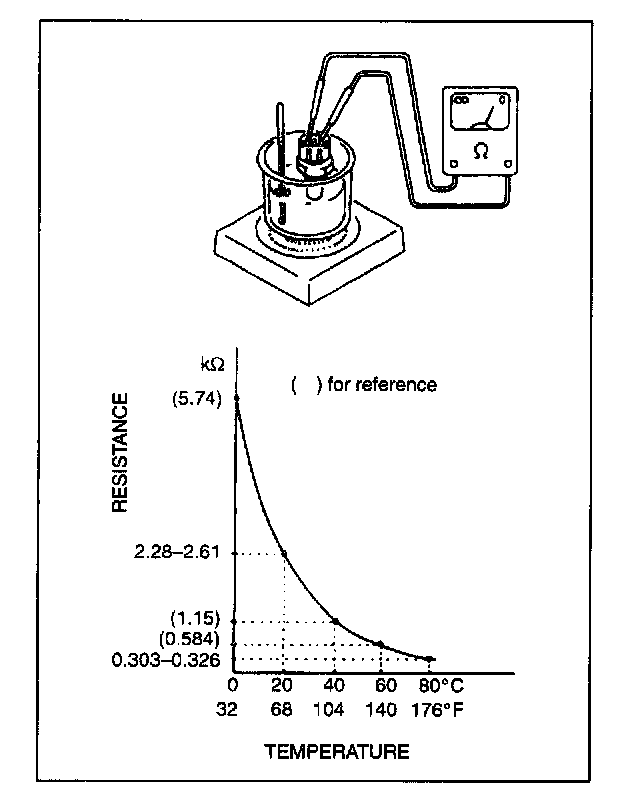 Immerse temperature sensing part of ECT sensor in water (or ice) and measure resistance between sensor terminals while heating water gradually.
