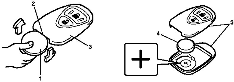 2. Replace the battery (lithium disc-type CR2032 or equivalent) (4) so its "+" terminal faces the "+" mark of the transmitter (3).