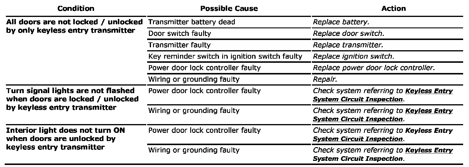 Confirm that power door lock system is in good condition before referring to the following possible causes