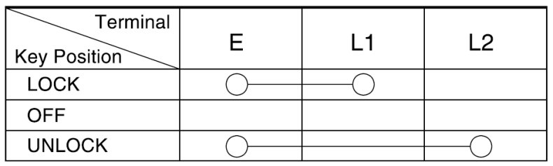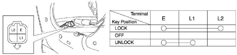 Door Key Cylinder Switch (Driver and Passenger Side) InspectionCheck for continuity between terminals at each switch position. If check result is not as specified, replace key cylinder.