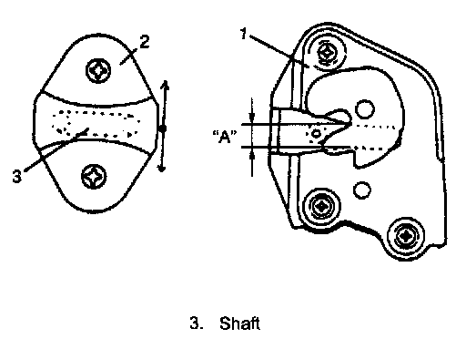 - Move door latch striker (2) up or down so its center aligns with the center of groove "A" on the door lock assembly (1) as shown.