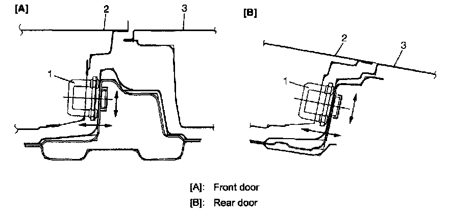 - Move door latch striker (1) sideways to adjust door outer panel surface (2) flush with another door outer panel or body outer panel surface (3) as shown.