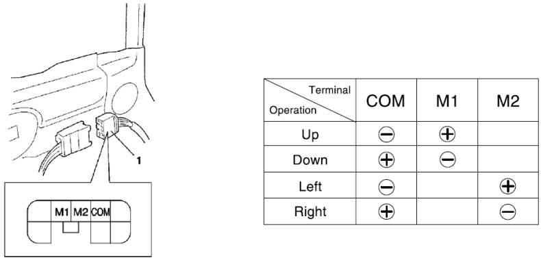 4. Connect battery positive (+) and negative (-) terminal to the door mirror terminal as shown. If it does not follow the table's operation, replace door mirror assembly.