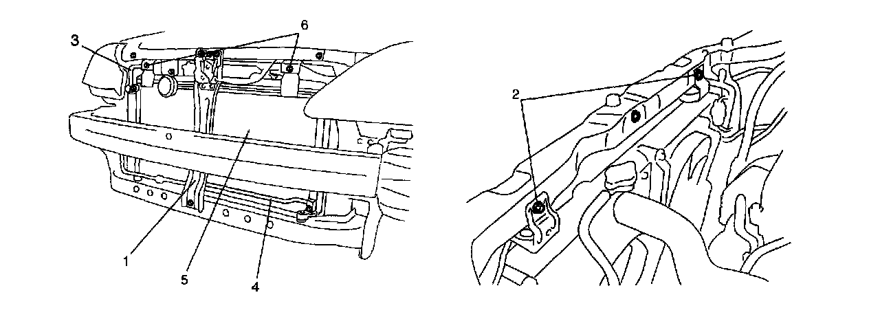 4. Remove hood lock cross member (1) and radiator stay bolts (2).
