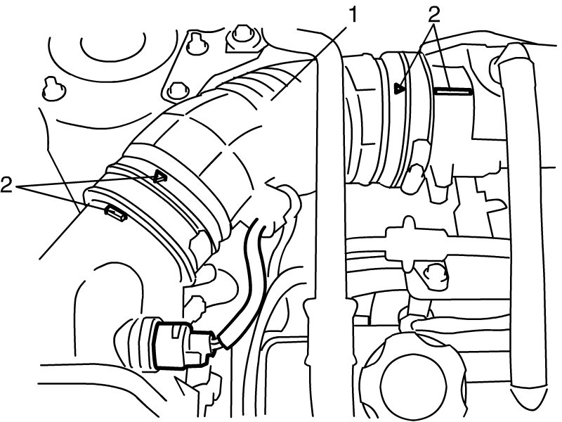 1) Install air cleaner outlet hose (1) by aligning match marks (2) as shown in figure.
