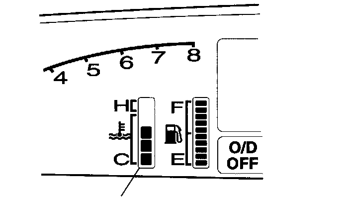4. Warm up engine till fluid temperature reaches normal operating temperature (70 - 80°C/158 - 176°F). As a guide to check fluid temperature, warm up engine till engine coolant temperature meter (1) indicates up to 2nd or 3rd segment from lowest segment as shown in figure.