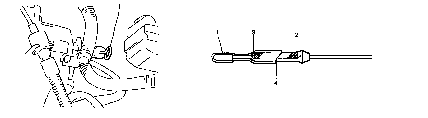 7. Pull out fluid level gauge (1) again and check fluid level (4) indicated on it. The lowest fluid level should be between FULL HOT (2) and LOW HOT (3). If it is below LOW HOT, add an equivalent of DEXRON (R) III or DEXRON (R) IIE up to FULL HOT.