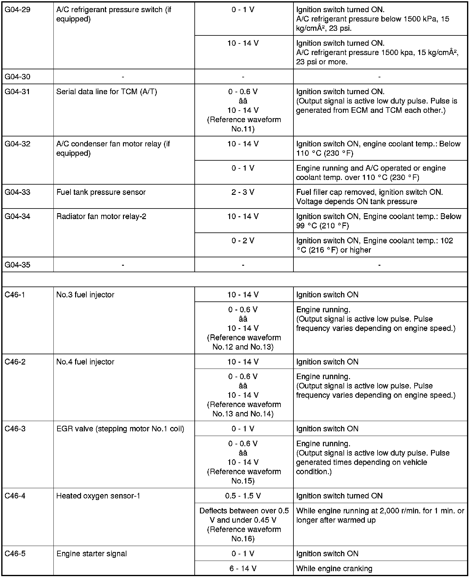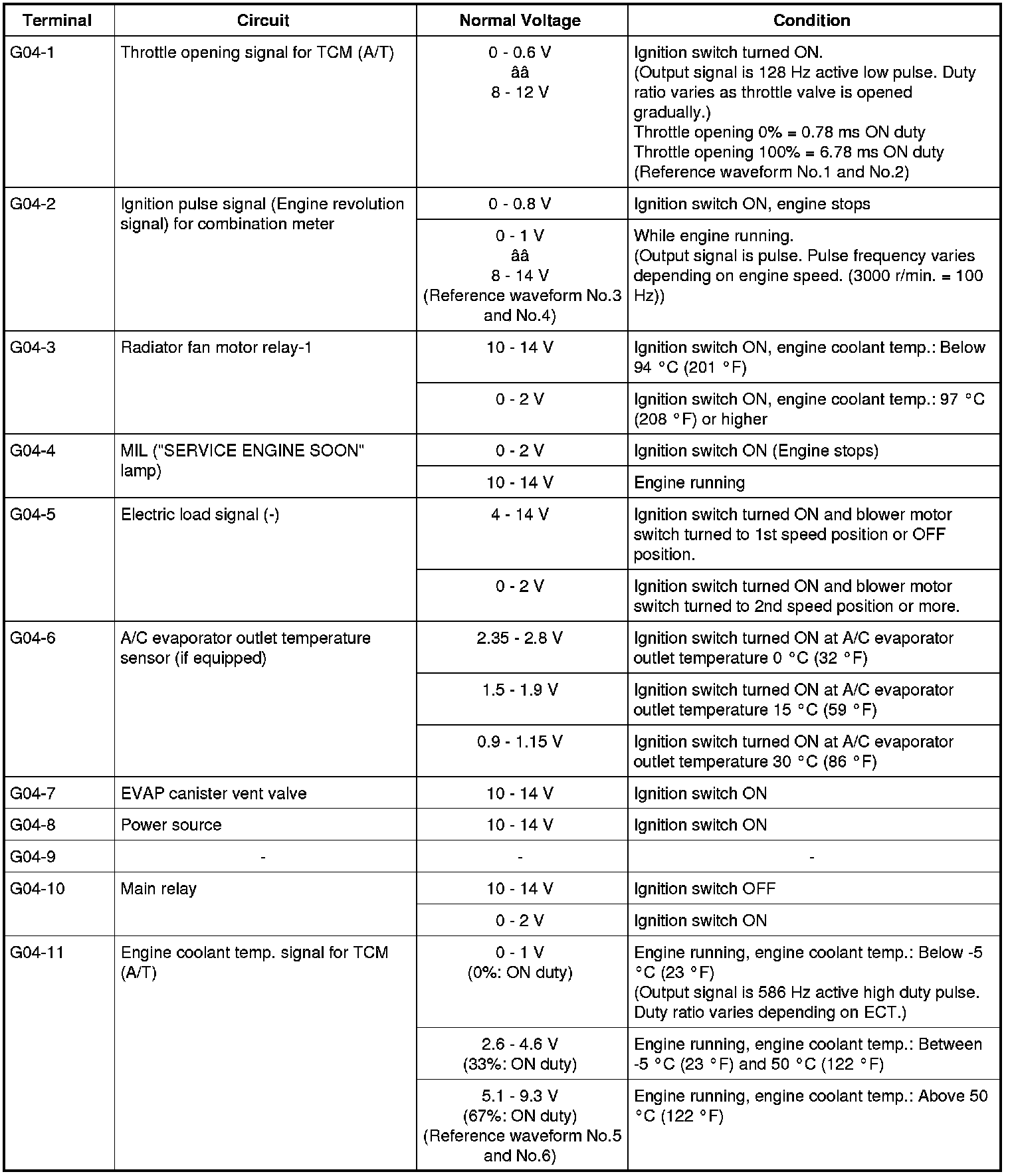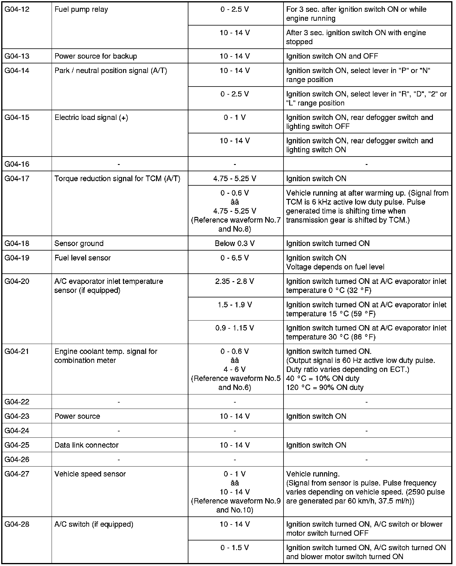 - As each terminal voltage is affected by the battery voltage, confirm that it is 11 V or more when ignition switch is turned ON.
