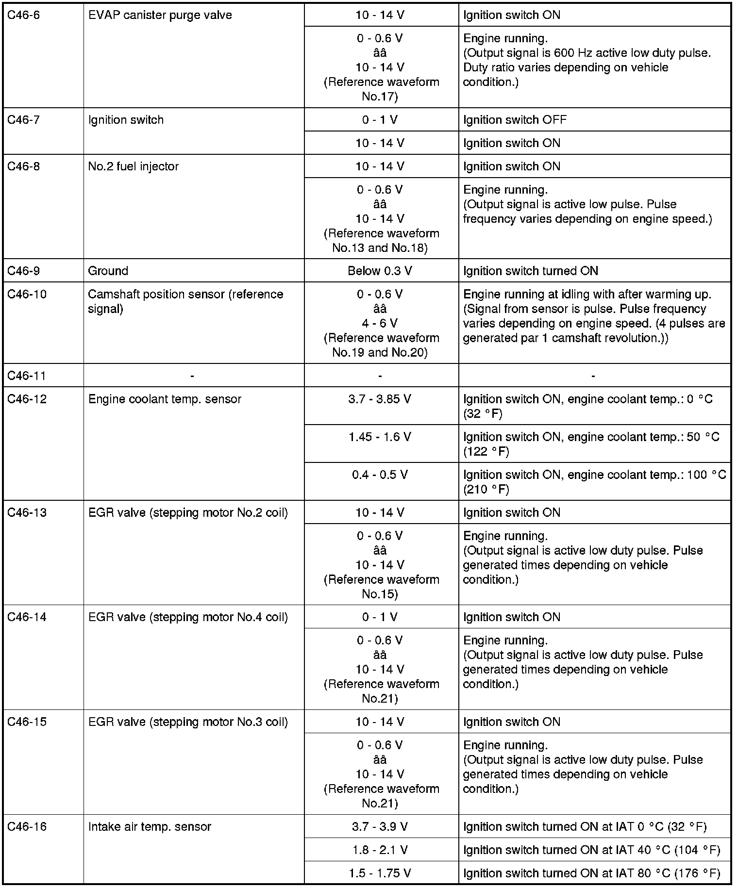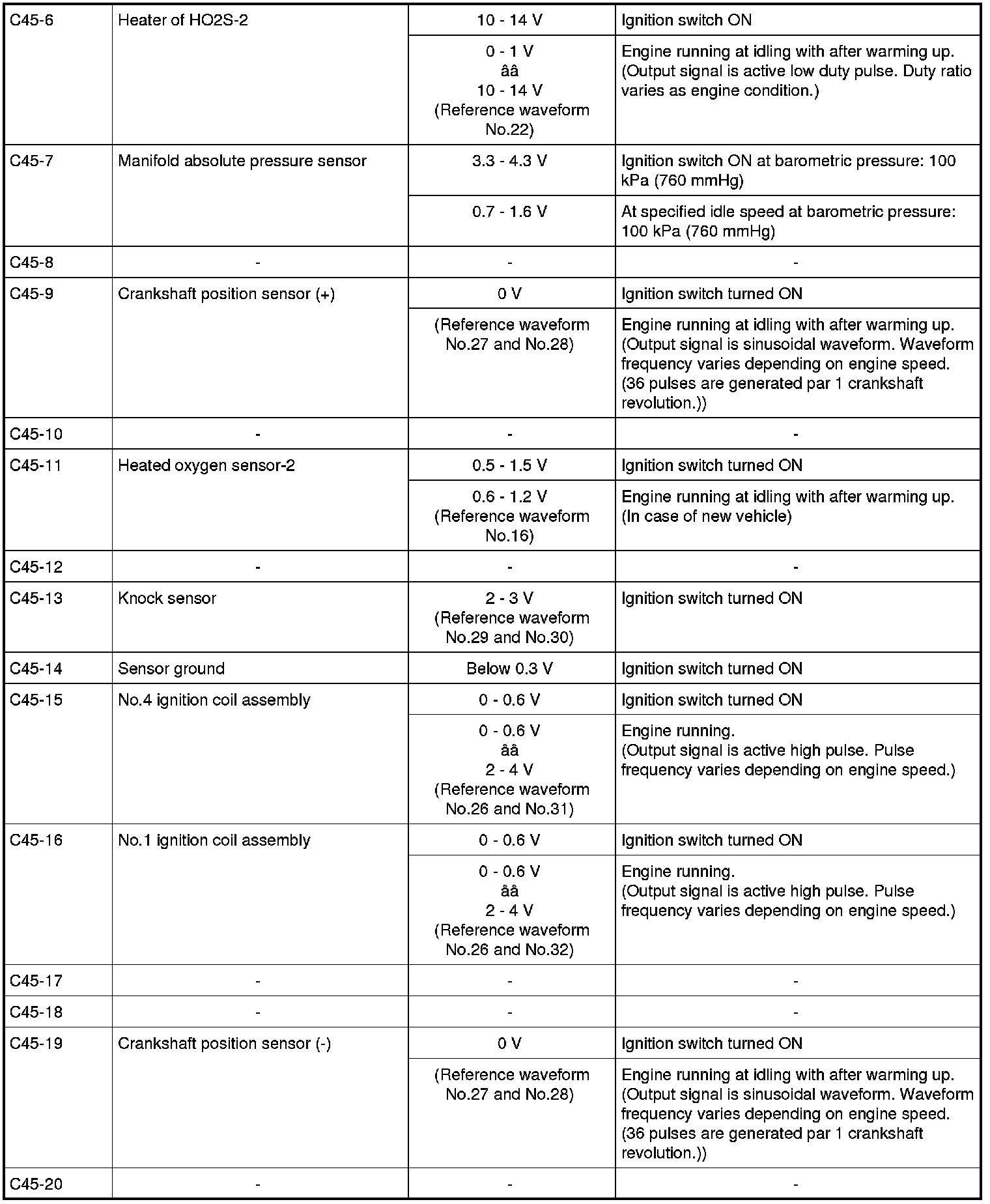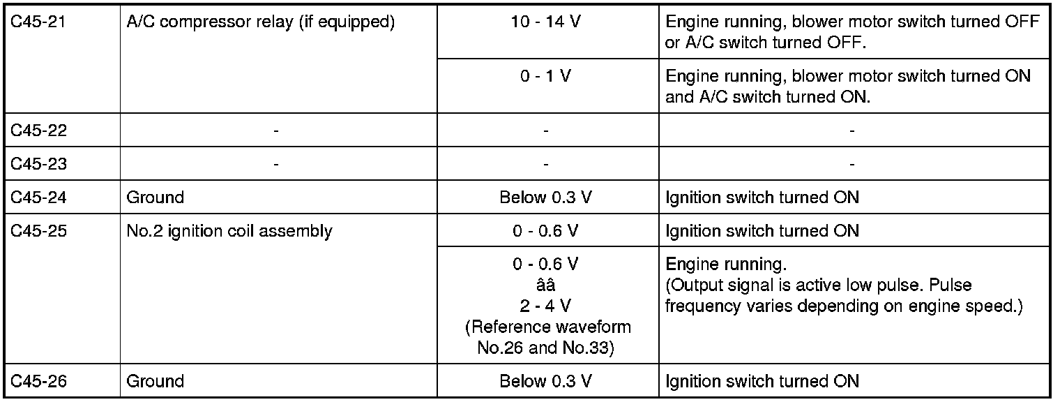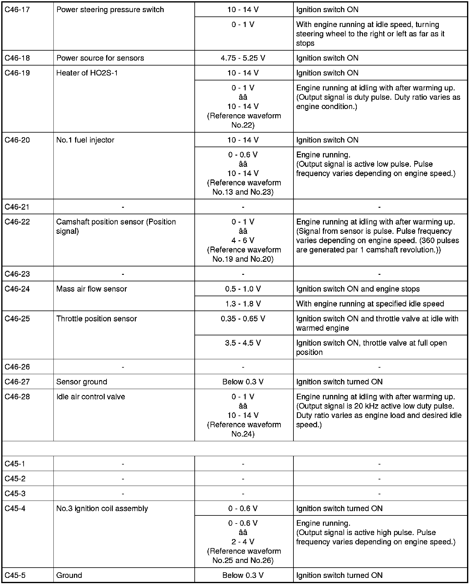 - As each terminal voltage is affected by the battery voltage, confirm that it is 11 V or more when ignition switch is turned ON.