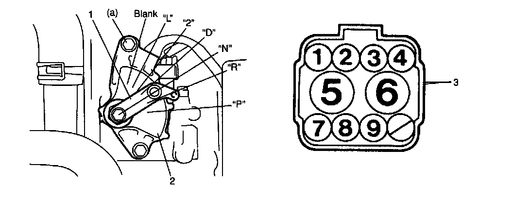 2. Connect ohmmeter between 7 and 9 terminals of disconnected transmission range sensor connector (3).