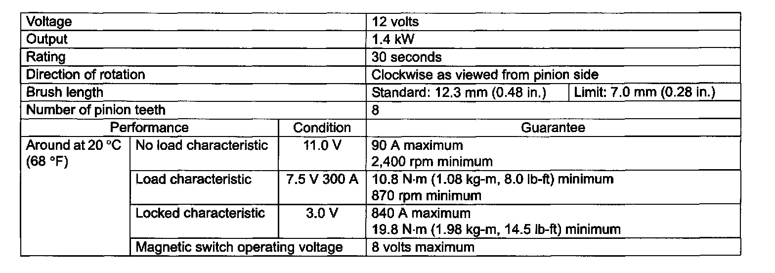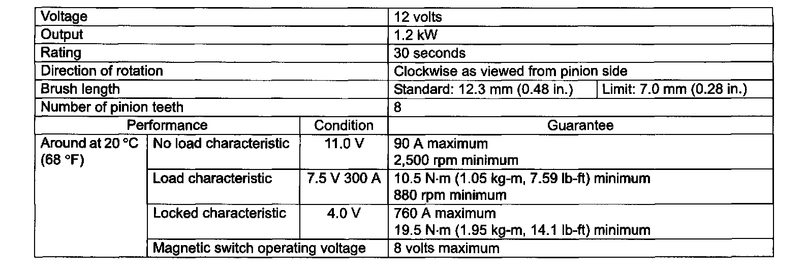 Starting motor varies depending on specifications, etc. Therefore, be sure to check model and specification of the vehicle being serviced before replacing parts.