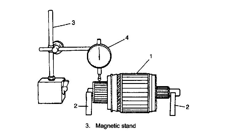 - Check commutator for uneven wear with armature (1) supported on V-blocks (2). If deflection of dial gauge (4) pointer exceeds limit, repair or replace.