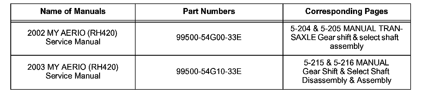 This note is to inform you of the installation direction of gear shift interlock plate in the manual transmission for the 2002 MY and 2003 MY AERIO (RH420).