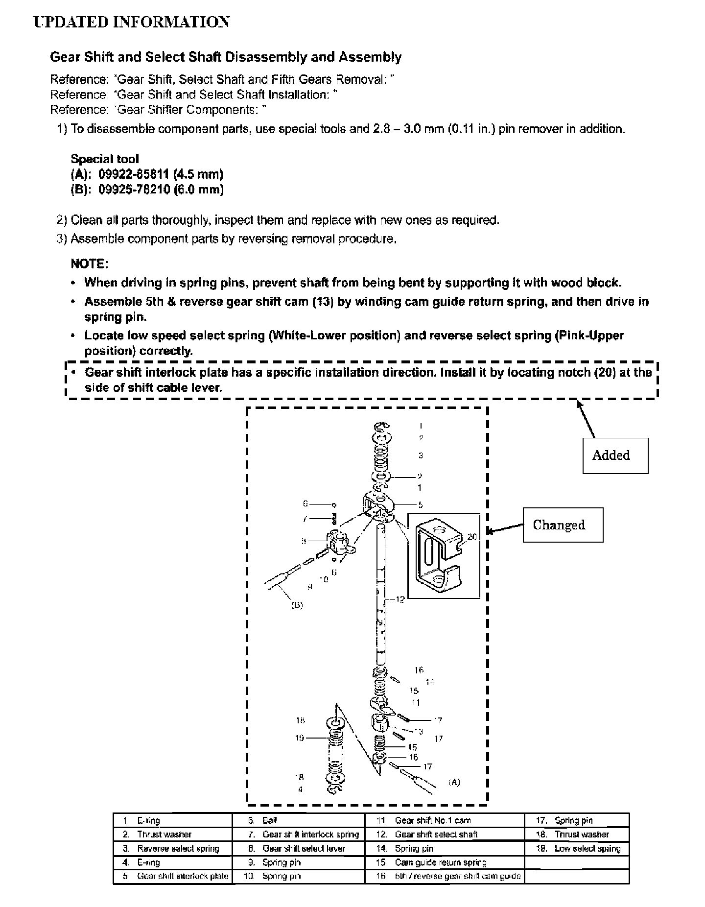 The gear shift interlock plate must be installed in the specified direction as shown below. Please update your Service Manual according to the updated information below.