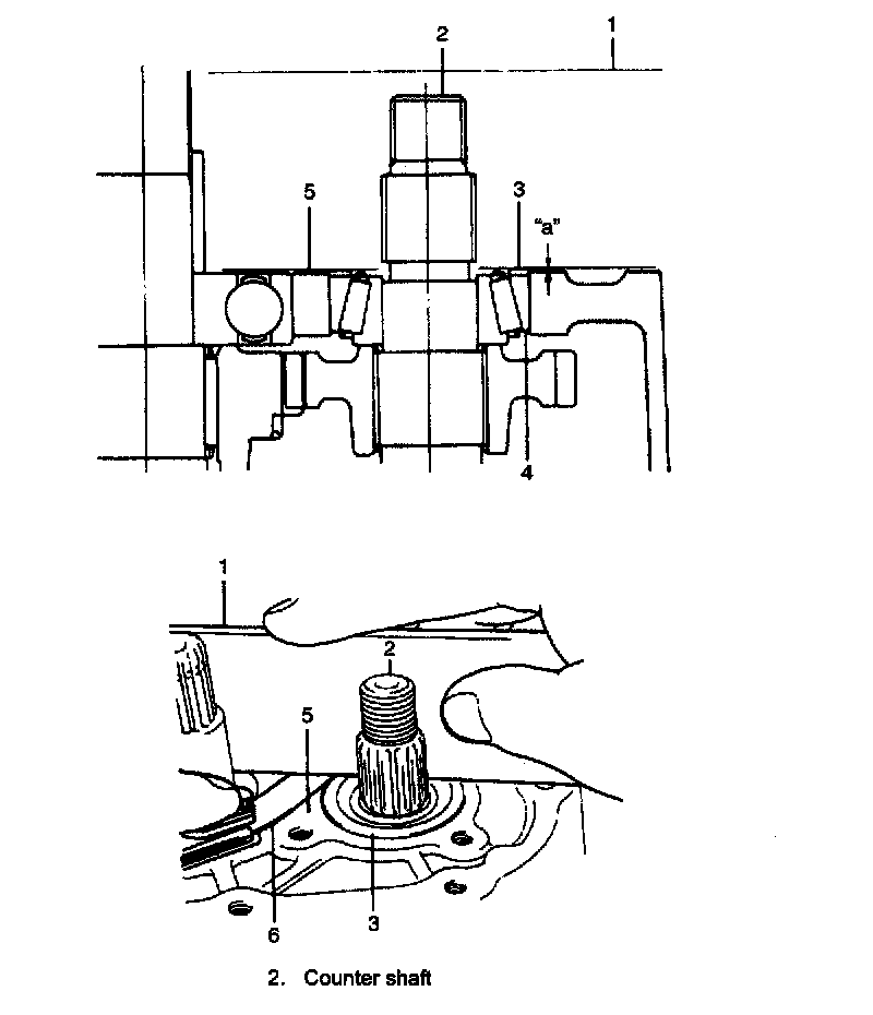 2. Put a shim (3) on bearing cup (4) provisionally, place straight edge (1) over it and compress it by hand through straight edge, and then measure "a" (Clearance between case surface (5) and straight edge) by using feeler gauge (6).