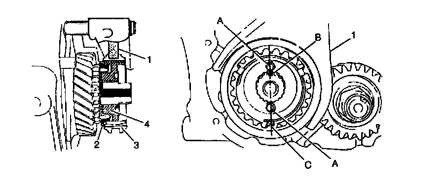 10. Fit 5th gear shift fork (1) to sleeve (3) & hub (4) assembly and install them into input shaft, gear shift shaft at once aligning hub depression A, shaft mark B and synchronizer key C.
